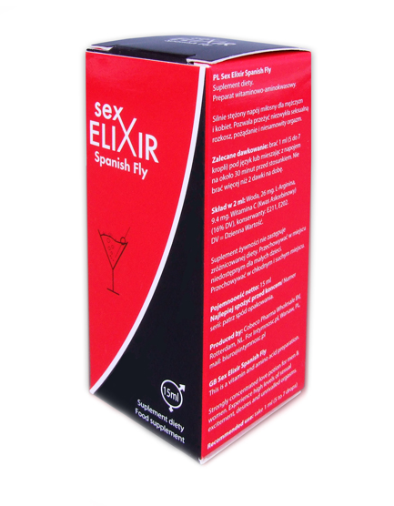 Afrodyzjak Sex Elixir oparty jest na sprawdzonej recepturze, której głównym składnikiem jest ekstrakt z hiszpańskiej muchy. Jego działanie dodatkowo podparte jest składnikami silnie wzmagającymi podniecenie seksualne. Hiszpański temperament zawarty w paru kroplach!